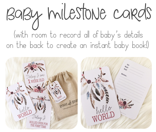 Baby milestone cards are a beautiful way of recording baby's first year with a collection of photos taken with a card alongside them. Each card measures 10x15cm (Approximately 4x6") and each are printed using a gorgeous linen textured card stock with each card having rounded edges. As each milestone happens simply place the appropriate card next to baby (or they can hold it as they get older) and take a photo. On the back of each card you are able to record the date, baby's weight and height and any other milestones they have reached at that time. The pack of 28 cards are beautifully presented in a hand stamped cotton drawstring bag. Once all the cards are completed, simply pop them back in the beautiful cotton bag to keep for when baby grows up. Perfect gift for a baby shower, when baby arrives...or buy for your own baby as a beautiful keepsake for them as they grow up. Each set includes the following cards: - Hello World - 1, 2, 3 weeks old - 1, 2, 3, 4, 5, 6, 7, 8, 9, 10, 11 Months old - 1 year old - Today I sat up for the first time - Today I rolled over for the first time - Today I crawled for the first time - Today I giggled for the first time - Today I took steps for the first time - Today I walked for the first time - Today I smiled for the first time - Today I said my first word - Today I got my first tooth - Today I ate solids for the first time - Today Is my first Christmas - Last night I slept through the night PLEASE NOTE: ALL computer monitors, tablets and printers are calibrated differently. Slight color differences may occur. We test all our design using our professional printers before releasing any designs. Your final printed cards may appear slightly different in colour to the colours you see on your monitor or phone. **Artwork we use in our designs such as clipart elements and backgrounds have been created by groovy goose or we have purchased the license from the creator of some elements of the artwork and we are able to use them with permission in our designs.